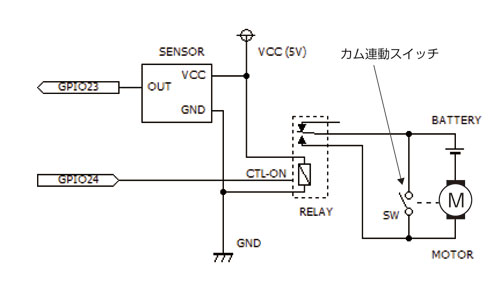 手洗い装置にはセンサーを2個使います。1個は手を水栓コックの下にかざした時に反応する人感(モーション)センサー、もう1個は栓の開閉位置を検出するスイッチです。全開・全閉位置は90度毎に訪れます。閉(0度)→開(90度)→閉(180度)→開(270度)→閉(360度)で元に戻るわけです。実現には動力源の回転軸に4ヶ所のへこみが付いたカムを付け、これでマイクロスイッチをON/OFFするようにします。へこみ部分でスイッチがOFFになることでモーターを停止するのです。再びモーターを回転させるために、スイッチと並列にリレーの接点をつなぐことで、リレーによるモーターONを可能にします。そのトリガーには人感センサーを使います。センサーが人の動き(手をコックの下にかざす)を感知すると一定時間(2秒程度)モーターを回すことで、軸が回転してカムが回りOFFだったスイッチがONになります。短時間ですがこの間はリレーがONでなければならないため、必要なパルス幅はRasPiで作り出して供給します。次にOFFになるまではスイッチによって通電を続けるため、水栓の開閉制御が可能になるわけです。