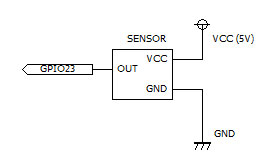 人感センサーの電源はVCC=5VとGNDに、出力はGPIO23(16ピン)に接続します。手洗い装置と同じピン接続に合わせたので、検出プログラム部分をそのまま流用できます。検出すると端子が"H"レベルとなりプログラム上では値"1"が取得できます。