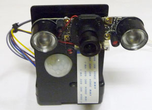 実は防犯カメラ本体部分のレイアウトには、欠陥があることに後から気付きました。人感センサーがカメラの両サイドにある赤外線投光器の熱(大電流を流すためにかなりの熱を放出する)を感知して、誤動作を起こす可能性があるのです。直接問題が発生したわけではありませんが、対策としてフレネルレンズの上にカバーを付け、センサーが余計な熱源を感知しないようにした方が良いかもしれません。