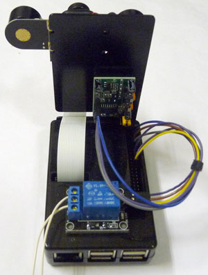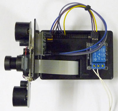 続いて上面から。照明用のライトをON/OFFするリレーユニットを、クッション付の両面テープでケースに貼り付けています。リレーはGPIO24(18ピン)に接続しています。これも手洗い装置と同じピンに合わせています。