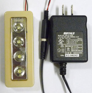 最後にLEDライトです。4連の白色LEDはかなり明るいものですが、これで光量が不足するならもう1基ライトを追加するつもりです。電池は単四を3本(4.5V)内蔵し、前面の透明窓を押すとLEDが点灯するようになっています。これを少し改造し、電源はACアダプタを使って外部から取れるようにしました。点灯スイッチからも並列にリードを取り出して、外部でLEDをON/OFFできるようにしておきます。本体上部に取り付けたリレーユニットは、RasPiでこの操作をするためのものです。LEDライトは普段は暗闇で手動点灯して利用すれば良いでしょう。