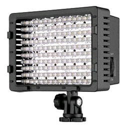 実は、このライトを暗闇で点灯してカメラ映像を確認したところ、赤外線モードのままになっていることがわかりました。明るいと思ってもこの程度では光量が全然足りないようです。恐らくダブルで点灯しても不足は補えないと予想されるため、ビデオ用の強力な投光器を導入することにしました。それが次に示すLEDビデオライトです。128個の白色LEDが一斉に点灯してかなり明るい印象です(まぶしくて直視は困難)。ただし、仕様によるとセンター光束で800ルクスとのことなので、近距離であれば目的を果たせそうですが、数メートル先となるとやや心もとない気もします(比較の参考までに、自宅室内の電灯の下で2000ルクス程度)。採用したビデオライトは9Vで駆動するもので、128個のLEDが並列と直列を組み合わせる形で接続されているものと思われます。回路は上記のものを踏襲する形になります。