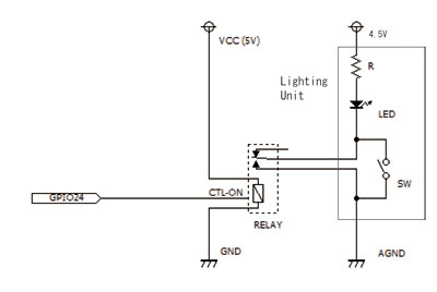 LEDライトの駆動回路は次の通りです。ユニット内にLEDを4個搭載しているため、実際のユニット部分の回路は図とは異なります。分解したところ抵抗は1キロオーム、LEDは並列に4個並んでいて、抵抗と直列に接続されていました。スイッチは電源+側に入っていて、今回のようにリレーでON/OFFするなら関係無いですが、FETでスイッチングするなら図のようにGND側に入るように改造する必要があります。