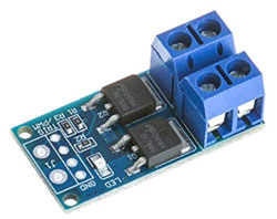 投光器のオン/オフにはリレーモジュールを使いましたが、ちょうど前に仕入れた手持ちが無くなったので、警告灯用に新たにパワーMOS-FETを使用した電子式のスイッチングモジュールを入手しました。amazonで5個セッで800円程なので、リレーモジュールと同等かやや安い感じです。