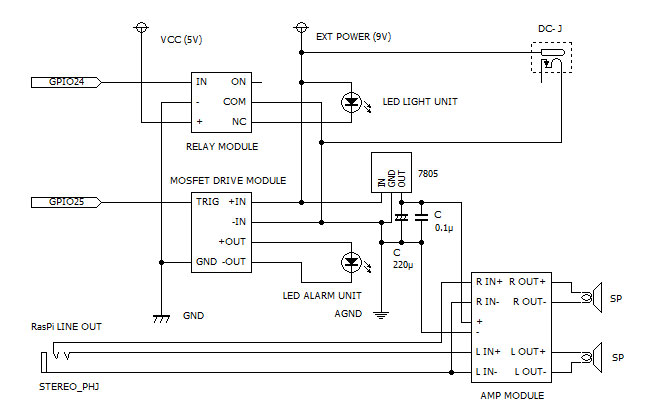 警告を更に強化するため、警告音も同時に鳴らすようにします。RasPiのアナログ音声出力を使うため、増幅するためのアンプを追加しました。これも安価なモジュールがamazonにあったので利用します。3W×3Wのステレオアンプで2個セット430円でした。警告用なのでモノラルで構わないのですが、丁度手頃なものが目に留まったので採用した次第です。電源の5Vはなるべくノイズを避けるため、投光器の9V電源から5Vの三端子レギュレーターで取り出しています。せっかくなので単独のステレオアンプとしても使えるように配慮しました。アンプモジュールはスイッチ付きのボリュームが付いているため、これだけで超小型のアンプが作れる優れものです。