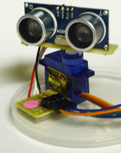 さて、本来の目的である距離測定に戻ります。前方の物体までの距離と角度を得るため、常にセンサーは首振り動作をします。センサーを細長く切った基板にスズメッキ線で固定し、その基板をビスでサーボホーンに取り付けました。サーボはプラ容器のフタに両面テープで固定してあるだけです。エコー出力を抵抗分圧するために、途中に中継基板を入れました。実験が目的なので、あくまでも簡易的な装置です。