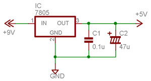 サーボの安定化を図るため独立した電源も用意しました。手元に9VのACアダプタがあったので、三端子レギュレーター7805で5Vの電圧を生成しています。一般的な用途なら下図の回路で大丈夫でしょう。入力電圧は出力5Vに対して3V以上は必要です。実験では9VのACアダプタを使用しました。電流を多く取るなら7805に放熱器が必要です。