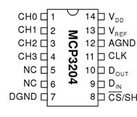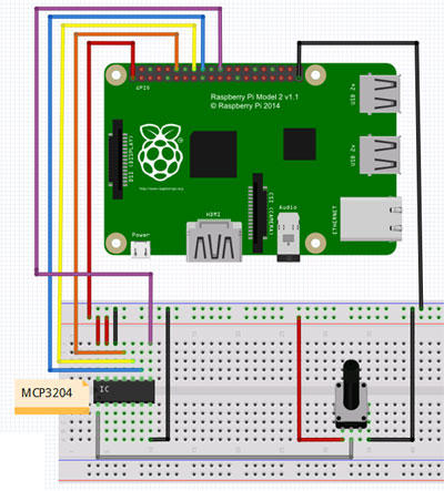 参考までにテスト回路は次のようなものです。接続したGPIOコネクタのピン番号は、図の下に追記したものになります。左がMCP3204のピンの名称で右がGPIOコネクタのピン番号(括弧内はGPIO番号)です。
