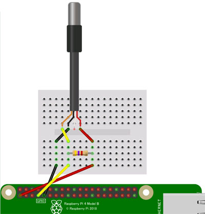 センサーは複数を並列に接続するだけで使えます。個別にIDのようなものが与えられていて、RasPi側できちんと区別してデータを取得してくれるようです。今回は2個のセンサーを使用し、前述の水分センサーと組にして、2組の地中センサーセットとして利用したいと思います。作例通りにGPIO4に温度センサー出力を接続してテストします。テスト回路は下図になります。ただし、図ではセンサーが1個ですが、テストも含めて2個を並列に接続して使います。なお、データ線は4.7kの抵抗でプルアップしています。