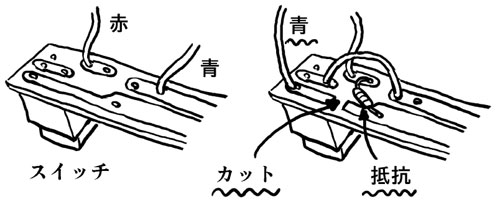 話を戻しますが、100均のLEDライトの回路を調べると、手動点灯スイッチは電源の+側に入っており、人感センサーの出力でオン/オフするには都合が悪い設計です。そこで改造を行ってスイッチを電源のマイナス側に入るようにしました。元々付いているプッシュスイッチと並列に電子スイッチ(今回はHC-SR501にて)を付ければ、どちらでも点灯制御ができます。ライト側の改造は簡単で、抵抗を外して取り付ける場所を変更し、更にパターンを1ヶ所カットして配線を一部変更します。下図を参考にして下さい。左側の図で、赤は電池の+側、青は電池の-側に接続されています。抵抗は20オームが入っていました。これを外して基板裏側にハンダ付け(右側の図)して改造すれば良いわけです。なお、図にはありませんが、スイッチの電源+側(3つある端子の中央)、スイッチの電源-側(青リード)、+電源(赤リード)の部分からリード線を外に取り出します。つまり電源+(4.5V)、電源-(GND)、コントロールの3線が外部とのインターフェースになるわけです。
