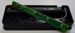 オーディオラック用のセンサーライトは組み込んで他に転用するつもりは無いので、外部電池のみの利用にしてDCプラグは削除しました。写真左はケース内のレイアウト、右はセット全体です。全部品含めても部品代は600円程でできると思います。なお、センサーライトで1点改造時に注意する点があります。元々スイッチ部分の精度がよく無いのか、改造後に本体スイッチを押してもスイッチが動作しない現象が発生(以前の改造でも経験)。確認したところ、スイッチが戻る際の距離が確保できずに、スイッチのON/OFF動作が機械的にうまくいかない状態になることがわかりました。回避策はケースの上下を組み付ける際に、スイッチ側を1ミリ程度浮かして接着してやると良いようです。リード線の取り出し部はケースのフタ側に切り込みがあるので、同じ位置のケース側をデザインカッターで半円状に切り取ってリード線(全部で5本)が通るようにしました。