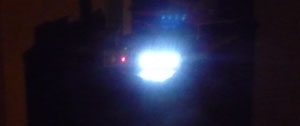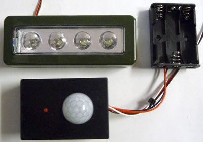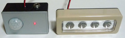 これらのセットによる実際の動作状況です。LEDに大電流を流すので室内ではそこそこ明るく、近くなら周囲もよく見えます。現在のセンサーのボリューム設定だと、距離が3~4m程度で反応します。感度を高く調整すると発振のような現象(消灯してもすぐに点灯)が起こる場合があるので、実用的にはこの程度が妥当と思われます。