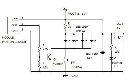 LEDライトは人感センサーの出力では駆動できないため、トランジスタ(2SC1815等)を間に入れてスイッチングします。センサー出力には1キロオームの抵抗が入っているので、そのままトランジスタのベースに接続しても大丈夫ですが、Lレベルが十分下がらないものもあり、念のため4.7キロオームの抵抗2本で分圧してベースに接続しています。電流を多く流すと検出動作が不安定になる現象も確認しているので、その対策も兼ねてのことです。ライト側のLEDには直列に20オームの抵抗が入っているため、そのままコントロール信号線をコレクタに接続します。トランジスタがオンになった時、LEDの電圧降下が0.7V、トランジスタが0.2Vとすると、コレクタ電流は180mA程になり、個別LEDには約45mAの電流が流れます。2SC1815の増幅度を100として、完全にLEDをオンにするためには2mA程度ベース電流を流す必要がありますが、現在の抵抗値なら十分条件を満たします。センサーのLレベル次第ではリークが発生するかもしれませんが、手元のライトでは特に問題は無さそうです。参考までに回路図は次の通りです。リークで点灯する場合は、トランジスタのベース・エミッタ間の抵抗を小さく(~1k程度で要調整)すると良いでしょう。