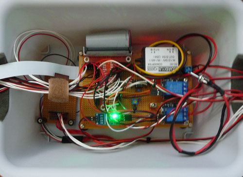 GARDEN-TECの制御ボックス内部は次のようになっています。写真では見えませんが、中央の基板の下にRasPi(モデル3B)があります。基板とRasPiをGPIOでケーブル接続することでI/Oを分離し、メンテナンス性を向上しています。