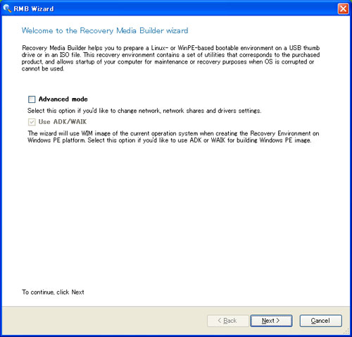 ●リカバリの実行 リカバリして復元するためのHDDまたはSSDを用意します。これが新しいシステムディスク(Cドライブ)になります。また、リカバリデータを保存したメディア(HDDやUSBメモリ等)も必要です。これらをマザーボードに接続し(安全のためリカバリデータを保存してあるドライブはUSB接続の方が無難)、光学ドライブに上記で作成した起動ディスクをセットします。あらかじめBiosでCDから起動するように設定した上で電源をオンにして下さい。起動ディスクが読み込まれてリカバリを実行する準備を開始します。下図のような画面が表示されたらNormal Modeを選択します。