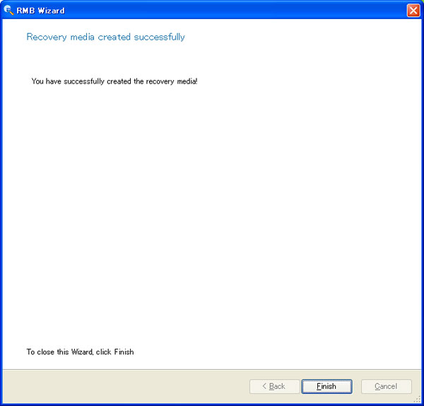 再び最初の画面に戻るので、作業を終了する場合はウインドウを閉じてソフトを終了します。 ●起動メディアの作成 本ソフトにはリカバリ時にPCをCD等から起動するためのメディア作成機能もあります。ソフトを起動した時に上部メニューバーの左端にあるアイコンをクリックすると縦に選択項目が表示されます。その中のParagon Recovery Media Buliderを選択すると起動することができます。また、システムトレイ内のプログラムメニューから直接起動することもできます。