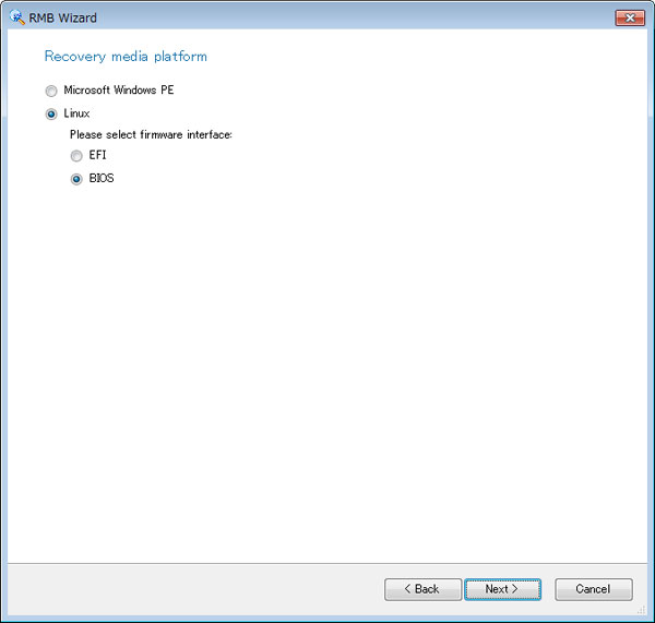 これで完了です。Finishボタンをクリックして終了して下さい。後は作成されたイメージファイルを使ってCDに書き込みを行います。Windows7以降は標準でライティング機能が搭載されています。それ以前は別途ソフトが必要ですので、適当なソフトを入手して書き込みを行って下さい。なお、起動用メディアのOSを選択する際に、下図のようにLinuxのオプションとしてEFIとBIOSの選択肢が表示される場合があります。リカバリするPCのマザーボードBIOSがどちらかあらかじめ確認しておいて下さい。最近のものはEFIまたはUEFIの場合が多いと思います(どちらもEFIを選択)。