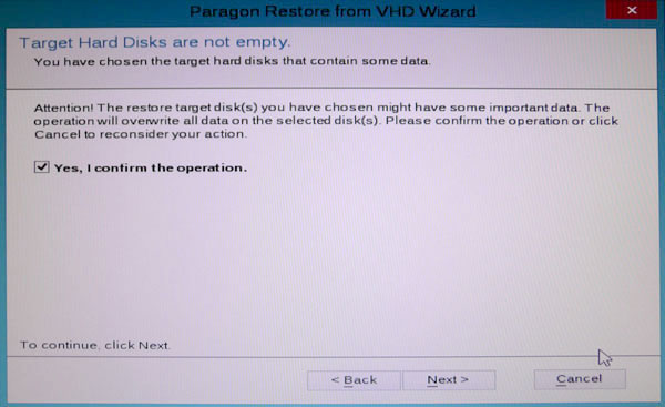 リカバリのためのSSDにデータが書き込まれていたために警告が表示されました。上書きするのでチェックボックスにチェックを入れてNextボタンをクリックします。空のドライブであればこの画面はスキップされるはずです。