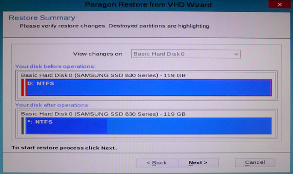 PCに接続してある全てのドライブを表示しています。上が今回リカバリ先となるSSD、次がデータ用に使う予定で接続してある空のHDD(リカバリには無関係なので、リカバリ時は外しておいた方が無難)、下がリカバリデータを保存してあるHDD(USB接続)です。CドライブになるはずのSSDがDドライブとなっていたので心配になりましたが、リカバリ後はちゃんとCドライブになっていました。また、この例でG、Hドライブになっているのはリカバリ前にPCで使っていたHDDで、元は各C、Dドライブだったものです。ドライブレターが本来と異なる点に注意して下さい。本項の最後でその点を説明します。問題無ければNextボタンをクリックして下さい。