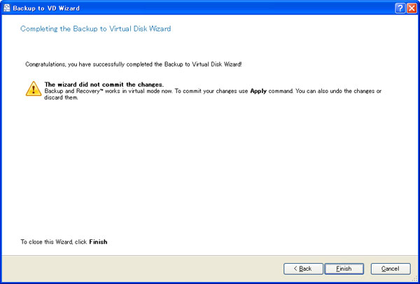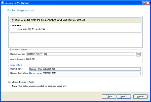 Backup to VDボタンをクリックして作業を開始します。別に下図のようなウインドウが開くので、ここで順次設定を行います。