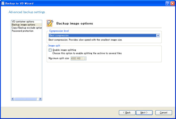 左のメニューの上から2番目、Backup image optionsをクリックします。右の選択肢のCmpression levelはBest Compressionを選択、下のImage splitはEnable image splittingのチェックを外します。こうすれば最良の圧縮をした上で分割せずに1つのバックアップファイルが作られます。指定を終えたらNextボタンをクリックします。