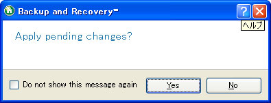 これは注意画面です。このソフトは設定を終えた後にメインウインドウでApplyボタンをクリックしないとリカバリ処理に入りません。そのための注意喚起を行っています。Finishボタンをクリックして設定ウインドウを閉じます。再び最初の画面に戻るので、上部のメニューのアイコン類の少し下にある一番左側のApplyボタンをクリックします。設定前はグレーで選択できませんでしたが、今はクリックできるようになっています。Applyボタンをクリックすると下図のダイアログが表示されます。リカバリ作成作業を開始するかの選択ですので、Yesをクリックして次に進みます。