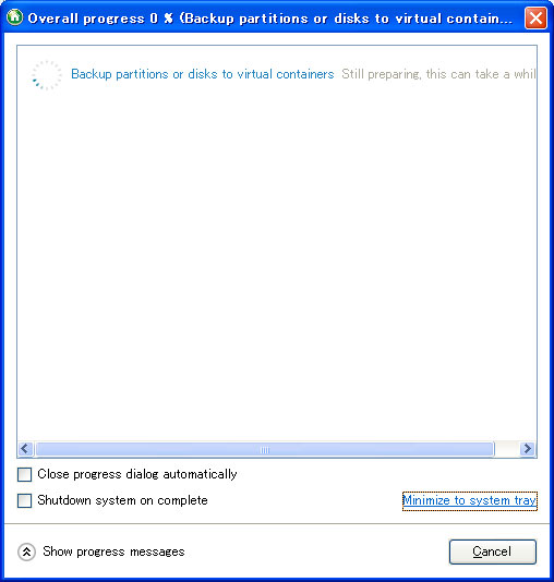 いよいよリカバリデータの作成に入りました。完了するまでしばらく時間がかかります。PCの性能やリカバリデータの容量によって処理時間も変わります。下に終了後に自動シャットダウンさせる等のオプションがあるので、必要に応じてチェックを入れて下さい。