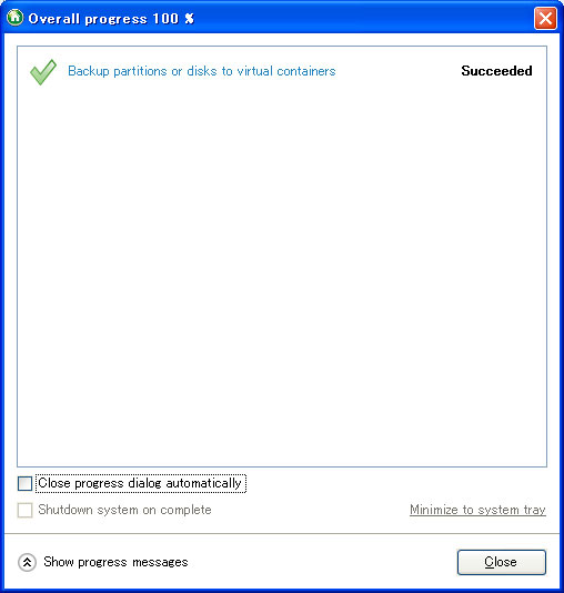 作成中はバーで状況を表示します。処理が終了すると下図の画面になります。右側にSucceededと表示されれば成功です。Closeボタンをクリックしてウインドウを閉じて下さい。