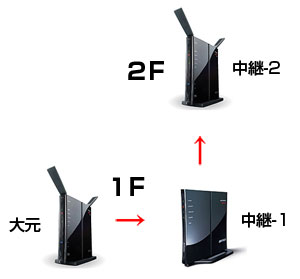 9.親機-親機で無線LANを拡張 (2015.10.28) 今や無線LANは一般家庭でも当たり前の時代になりました。私もずいぶん昔から、Buffalo(旧メルコ)製のAirstationを使って無線LANを利用しています。2~3年前からは親機を1台中継用に使って、インターネット回線端末近くに設置した親機との間で、遠距離の無線LANを構築しています。中継器を使うことで電波状態が改善され、離れた場所にある無線LAN子機でも快適に通信が行えるようになりました。 私の家では光回線端末に接続した固定ルーターの無線LANは使わず、別に設置したAirstationをブリッジモードにして使っています。IPアドレスの付与はインターネットに接続する固定ルーターに任せ、無線LAN親機は単に有線/無線ハブ的な扱いです。これまでこの形でうまくいっていたので、今回は2階でも電波状態を良くしようと思い、更にもう1台の親機を中継用に追加することにしました。