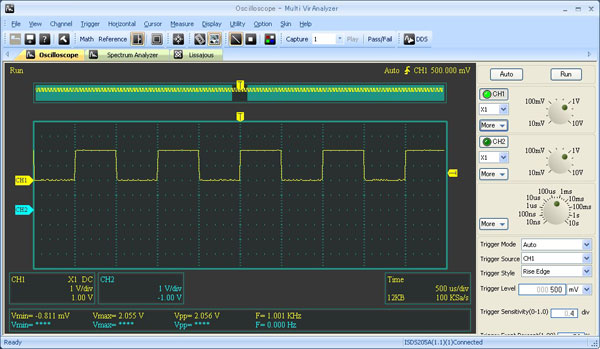 基準信号波形は2V P-Pなので、上図の波形を見ればノイズレベルが大体つかめると思います。数mV程度の微小電圧を測定する必要が無ければ、神経質になることも無いはずです。方形波もきちんと測定できていて、波形のなまりもほとんどありません。1KHzの信号に対して1.001KHzの測定値は予想以上の高性能です。電圧も基準が2Vに対して2.055Vとかなり優秀なレベルで、ホビーユースにはもったいないくらいです。測定ウインドウのパネルデザインはスタンドアロンのオシロを踏襲しているので、簡単な測定ならすぐに使いこなせそうです。好みの問題かもしれませんが、アナログ式の回転タイプのセレクタをそのままデザインしているため、マウスだとやや使いづらい点もあるかもしれません。個人的にはスライダ式にした方が、操作しやすいのではと感じました。まだほんの手始めの確認に過ぎないので、今後実際に使用してみて改めてレビューを追記するつもりです。