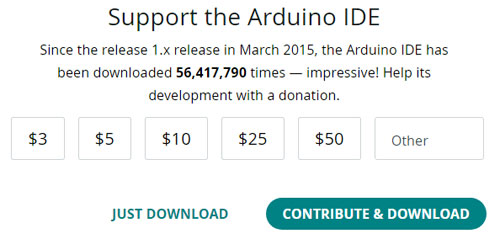 私の環境はWindowsなので「Windows」を選択しますが、MacやLinuxの環境なら目的のOSを選択して下さい。ダウンロード時の最新はArduino IDE 1.8.16でした。選択後に開くダウンロードページでは、寄付を募るようになっています。寄付をしたい方は金額をクリックした上で、下にある2つの選択肢のうち「CONTRIBUTE & DOWNLOAD」をクリックして下さい。そうで無い方でも「JUST DOWNLOAD」をクリックすれば、寄付をしなくてもダウンロードできます。次にメールアドレスを登録する画面になりますが、これも「JUST DOWNLOAD」をクリックすれば、登録無しですぐにダウンロードが始まります。なお、画面表記はこの先も変更されるかもしれませんが、基本は変わらないと思います。
