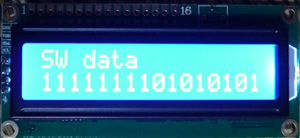 入力はディップスイッチがOFFの時にポート入力が"H"、ONの時に"L"になります。一方、出力は"H"の時にLED消灯、"L"の時にLED点灯になります。これを連携させるとスイッチOFFではLED消灯、ONではLED点灯になります。ビットの状態が分かるように、LCDに2進数で表示するようにしました。表示はスイッチONの時に"1"としています。なお、上位のビットが0の場合は除かれて表示されないため(仕様による)、便宜上16bit表示にして上位8bitは1が並びます。これは無視して下さい。スイッチの状態は下位8bitで表示します。