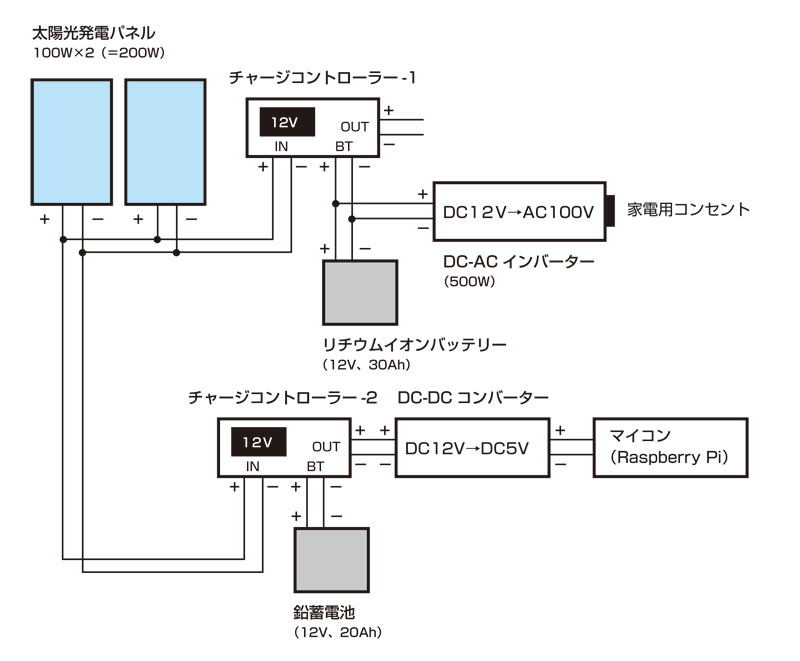 そこで、念のためチャージコントローラー2個を並列に接続し、マイコン専用バッテリーを別途追加することにしました。こちらは常時電力を消費するもののさほど消費量は多く無いことから、最初に試した鉛蓄電池(20Ah)を流用します。そして、こちらの系統を太陽光発電サブシステムとしました。ただし、チャージコントローラーの並列利用は事例が無く、あくまでも自己責任での使用になります。運用中に支障を感じるような場面はありませんが、コントローラー間で干渉のようなことが起きないとの保証はありません。入力側を共通にしているだけなので、個人的には特に問題は無いと考えています。
