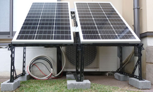 最初は暫定的にソーラーパネルを庭のフェンスに立てかけて設置していましたが、家屋のメンテナンスが終了したのを受けて、1日を通して最も日当たりの良い場所に移設しました。写真はソーラーパネルの設置状況です。金属ラック用のスチール製フレーム材を組み合わせて、ソーラーパネルの架台を製作しました。できる限り影にならないように、地面から30センチ程度浮かしてパネルを設置しています。向きは南向きで垂直方向の角度は45度程度です。実は背面にエアコンの室外機があり、廃熱を妨げないように配慮しました。パネルが地面から浮いているため、下の隙間に風が通るようになっています。うまい具合にパネルが室外機の日よけにもなり、エアコンにとっては冷却効率のアップが期待できます。また、パネルにとっても送風が冷却(熱風ですが直射日光による温度上昇は抑えられる)にもなるので一石二鳥です。
