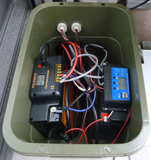 チャージコントローラーやバッテリーは密閉容器(ホームセンターで販売されていた収納ケースを利用)を加工して収めました。大きな電力を扱うため、主に雨水に触れないようにするためです。ただし、密閉すると日光と内部発熱による高温化を招くため、運用には注意が必要です。設置場所がソーラーパネルの背後で日陰のため、比較的温度は上がりにくい状況ですが、特に夏場の日中はフタを開けて空気の循環を促す必要がありそうです。冷却ファンで強制空冷を行う等の対策も考えるべきでしょう。